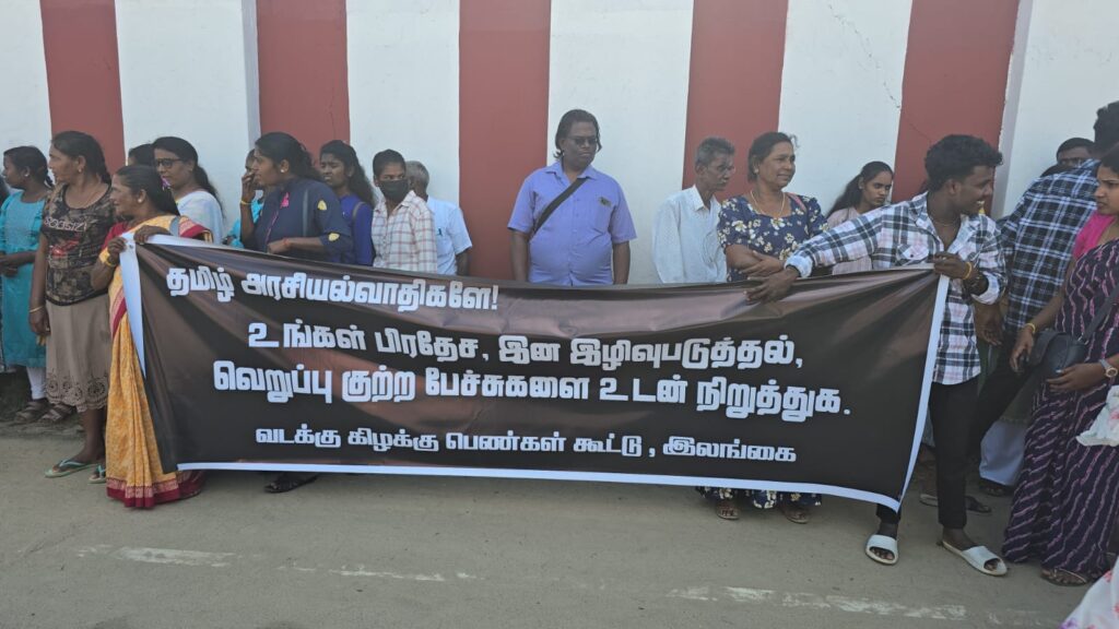 இனவாதம் மற்றும் பிரதேச,சாதிய வாதங்களை பேசும் தமிழ் நாடாளுமன்ற உறுப்பினர்கள் மற்றும் அரசியல்வாதிகளுக்கு எதிராக கோஷங்களை எழுப்பினர்.