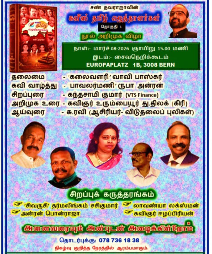 ஊடகவியலாளரும், எழுத்தாளருமான சண் தவராஜா எழுதிய “சுவிஸ் தமிழ் எழுத்தாளர்கள்” தொகுதி 1 நூல் அறிமுக விழா சுவிட்சர்லாந்தில் இடம்பெறவுள்ளது.