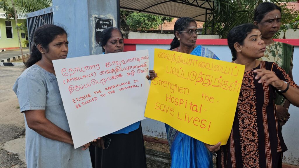 வைத்தியசாலையின் நோயாளர் காவு வண்டி காரைநகர் வைத்தியசாலைக்கு தற்காலிகமாக வழங்கப்பட்டதாகவும் போராட்டத்தில் ஈடுபட்ட மக்கள் தெரிவித்தனர்