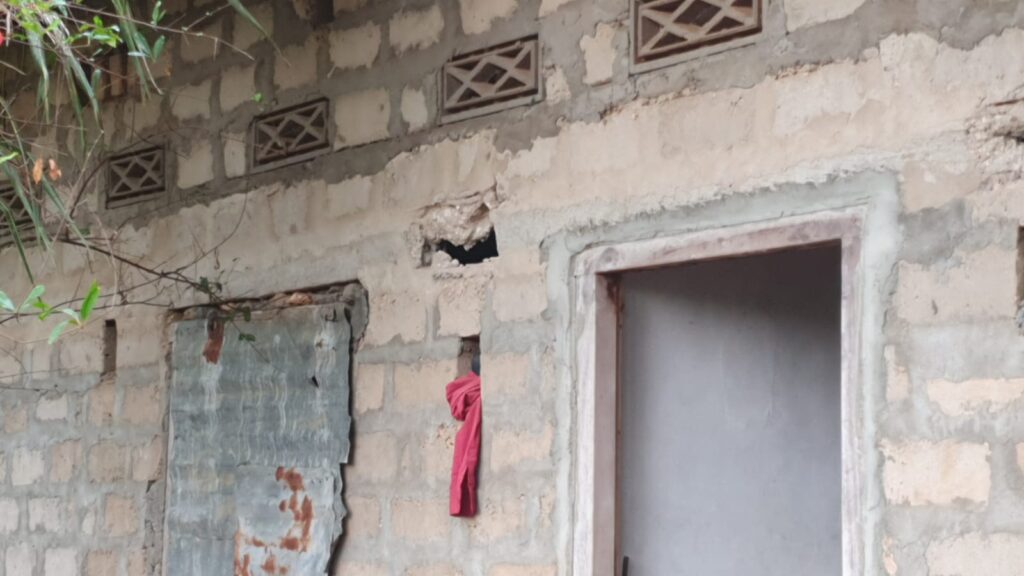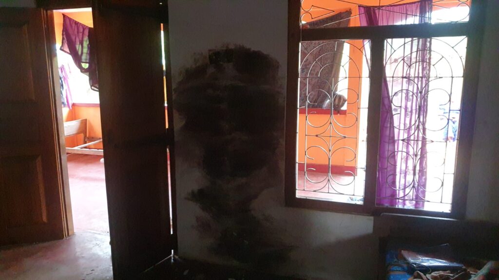 அதனால் தென்னை மரம் தீப்பற்றியதோடு, வீட்டின் சுவர்களும் சேதமடைந்துள்ளன.