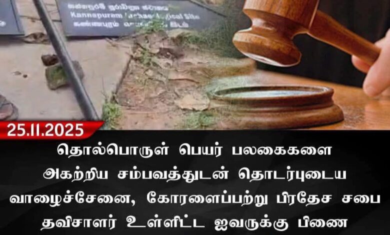 தொல்பொருள் பெயர் பலகை அகற்றப்பட்ட சம்பவம் தொடர்பில் கோரளைப்பற்று பிரதேச சபை தவிசாளர் உள்ளிட்ட ஐவரும் பிணையில் விடுவிக்கப்பட்டுள்ளனர்.